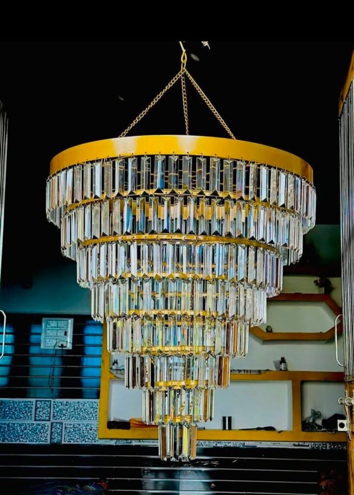 tiered modern gold chandelier with hanging glass
